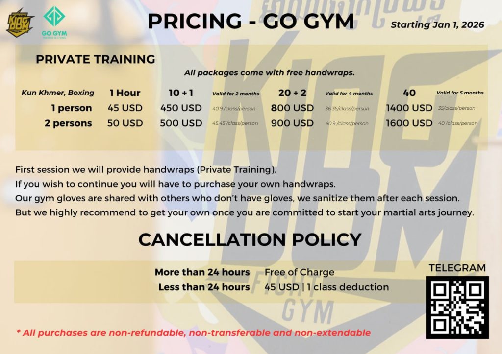 Kingdom Fight Gym, started in 2018 in Siem Reap and expanded to the capital, Phnom Penh , in 2021! KFG is bringing back Kun Khmer, mixed with K1 kickboxing. Kun Khmer shares the same roots with Muay Thai from Thailand, Muay Lao from Laos and Lethwei from Myanmar. Our team of experienced coaches (active and retired fighters, local and foreigners) will make sure you improve your techniques in a challenging, yet fun and friendly environment!